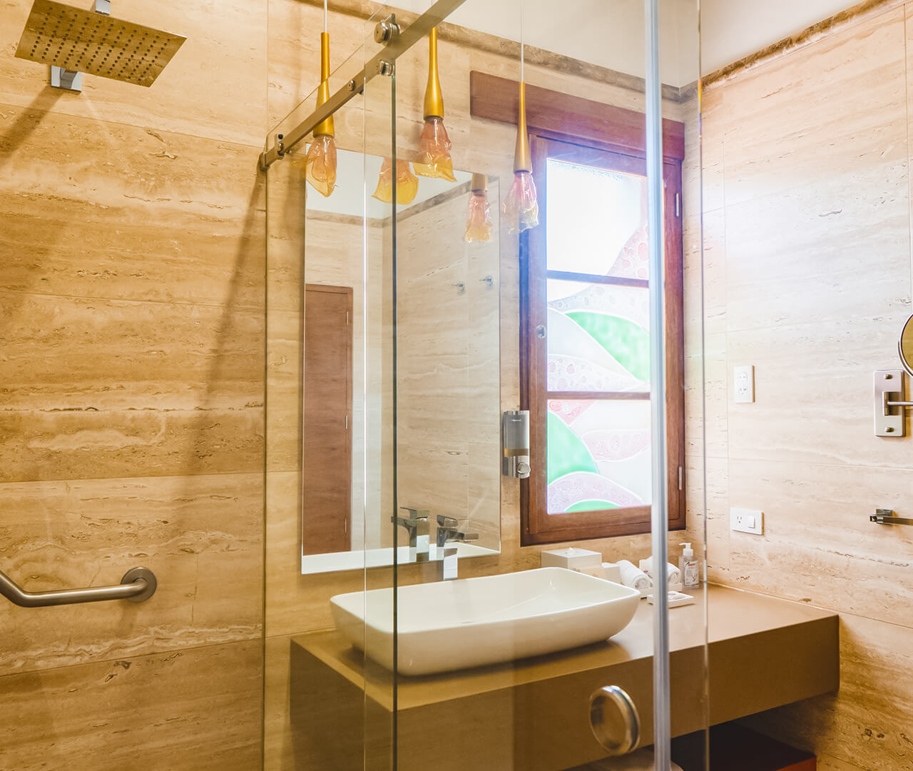 Count on a modern private bathroom with a walk-in shower and rain-fall shower head accompanied by bathrobes and slippers that beckon you to unwind. A desk area provides easily accessible electrical outlets, as well as a refreshment center presenting exquisite high-altitude Ecuadorian coffee, traditional and herbal blends of tea, and complimentary all-natural bites to eat.